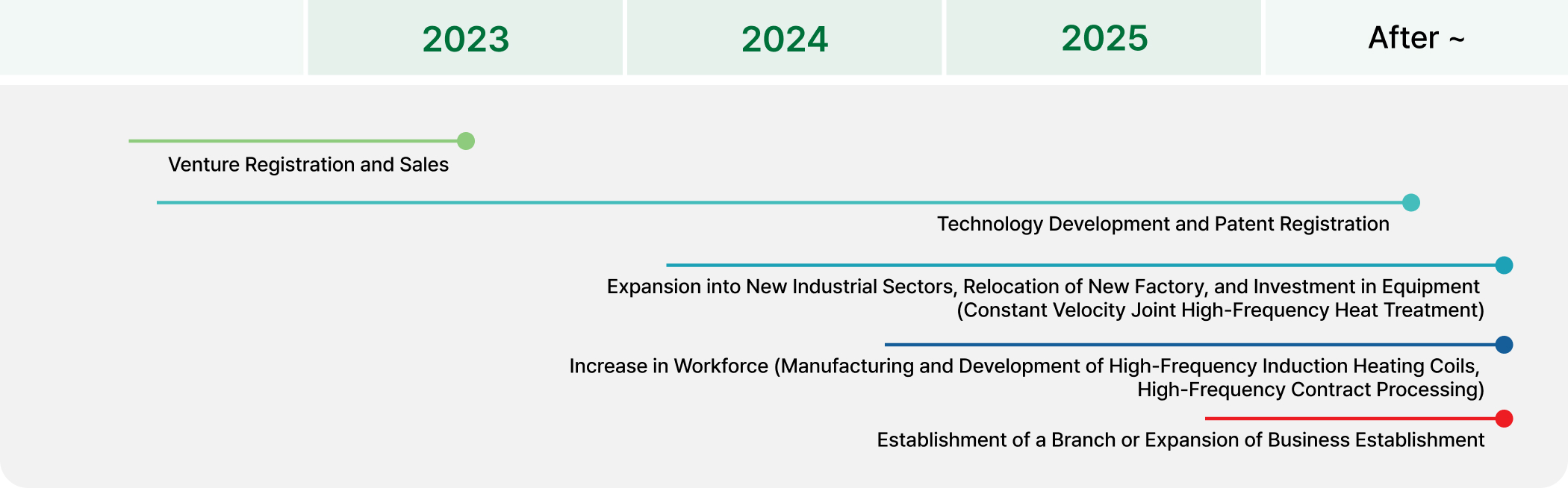 We will secure the highest level of technological expertise in the fields of high-frequency application devices and nano mold heat treatment technology development, and build a product lineup capable of meeting the diverse needs of our customers.System Development Plan